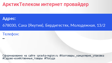 АрктикТелеком, интернет-провайдер по адресу 678030, Саха (Якутия), Бердигестях, Молодежная, 13/2 в дальнейшем Организация, размещена в следующих категориях:
