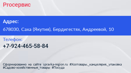 Proсервис по адресу 678030, Саха (Якутия), Бердигестях, Андреевой, 10 в дальнейшем Организация, размещена в следующих категориях: