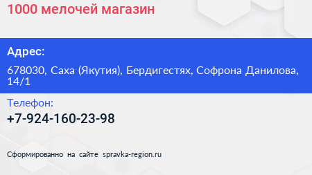 1000 мелочей, магазин по адресу 678030, Саха (Якутия), Бердигестях, Софрона Данилова, 14/1 в дальнейшем Организация, размещена в следующих категориях: