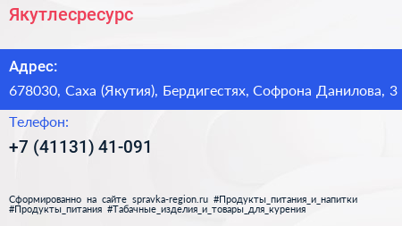 Якутлесресурс по адресу 678030, Саха (Якутия), Бердигестях, Софрона Данилова, 3 в дальнейшем Организация, размещена в следующих категориях: