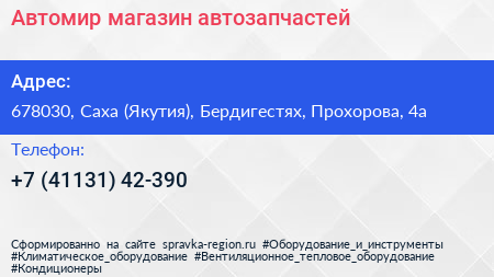 Автомир, магазин автозапчастей по адресу 678030, Саха (Якутия), Бердигестях, Прохорова, 4а в дальнейшем Организация, размещена в следующих категориях: