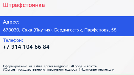 Штрафстоянка по адресу 678030, Саха (Якутия), Бердигестях, Парфенова, 58 в дальнейшем Организация, размещена в следующих категориях: