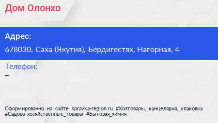 Дом Олонхо по адресу 678030, Саха (Якутия), Бердигестях, Нагорная, 4 в дальнейшем Организация, размещена в следующих категориях: