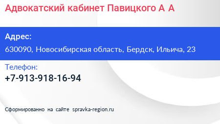 Адвокатский кабинет Павицкого А.А. по адресу 630090, Новосибирская область, Бердск, Ильича, 23 в дальнейшем Организация, размещена в следующих категориях: