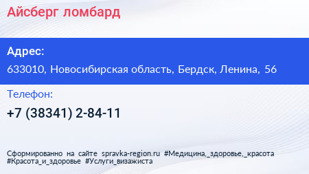 Айсберг, ломбард по адресу 633010, Новосибирская область, Бердск, Ленина, 56 в дальнейшем Организация, размещена в следующих категориях: