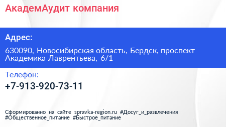 АкадемАудит, компания по адресу 630090, Новосибирская область, Бердск, проспект Академика Лаврентьева, 6/1 в дальнейшем Организация, размещена в следующих категориях: