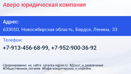 Аверо, юридическая компания по адресу 633010, Новосибирская область, Бердск, Ленина, 33 в дальнейшем Организация, размещена в следующих категориях: