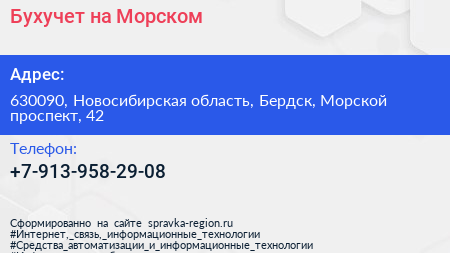 Бухучет на Морском по адресу 630090, Новосибирская область, Бердск, Морской проспект, 42 в дальнейшем Организация, размещена в следующих категориях: