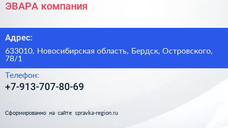ЭВАРА, компания по адресу 633010, Новосибирская область, Бердск, Островского, 78/1 в дальнейшем Организация, размещена в следующих категориях: