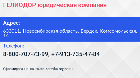 ГЕЛИОДОР, юридическая компания по адресу 633011, Новосибирская область, Бердск, Комсомольская, 14 в дальнейшем Организация, размещена в следующих категориях: