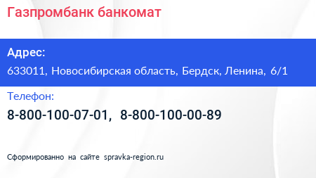 Газпромбанк, банкомат по адресу 633011, Новосибирская область, Бердск, Ленина, 6/1 в дальнейшем Организация, размещена в следующих категориях: