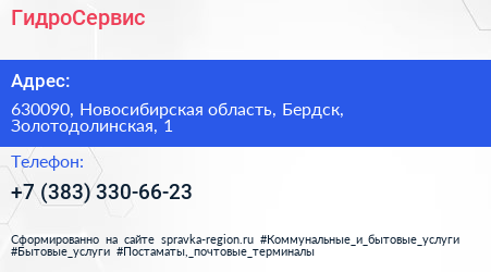 ГидроСервис по адресу 630090, Новосибирская область, Бердск, Золотодолинская, 1 в дальнейшем Организация, размещена в следующих категориях: