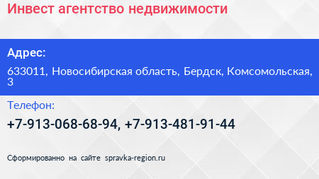 Инвест, агентство недвижимости по адресу 633011, Новосибирская область, Бердск, Комсомольская, 3 в дальнейшем Организация, размещена в следующих категориях: