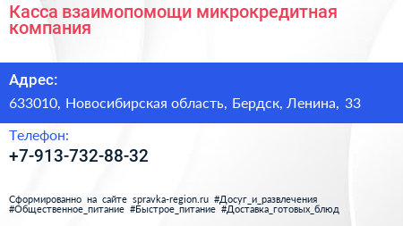 Касса взаимопомощи, микрокредитная компания по адресу 633010, Новосибирская область, Бердск, Ленина, 33 в дальнейшем Организация, размещена в следующих категориях: