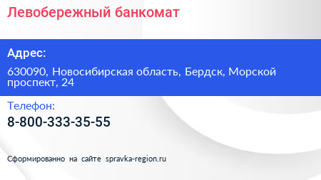 Левобережный, банкомат по адресу 630090, Новосибирская область, Бердск, Морской проспект, 24 в дальнейшем Организация, размещена в следующих категориях: