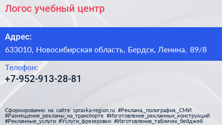 Логос, учебный центр по адресу 633010, Новосибирская область, Бердск, Ленина, 89/8 в дальнейшем Организация, размещена в следующих категориях:
