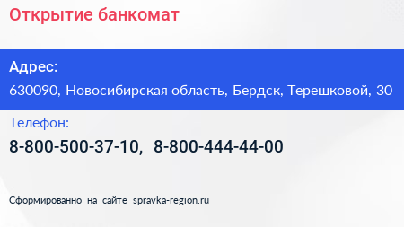 Открытие, банкомат по адресу 630090, Новосибирская область, Бердск, Терешковой, 30 в дальнейшем Организация, размещена в следующих категориях: