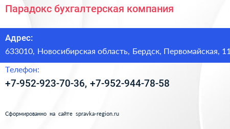 Парадокс, бухгалтерская компания по адресу 633010, Новосибирская область, Бердск, Первомайская, 11 в дальнейшем Организация, размещена в следующих категориях: