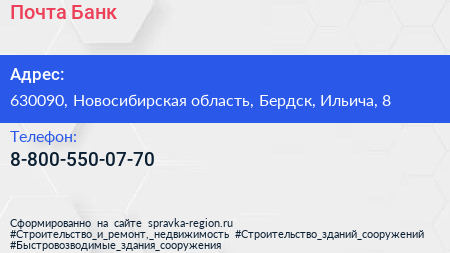 Почта Банк по адресу 630090, Новосибирская область, Бердск, Ильича, 8 в дальнейшем Организация, размещена в следующих категориях: