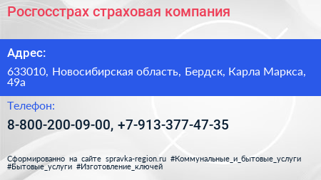 Росгосстрах, страховая компания по адресу 633010, Новосибирская область, Бердск, Карла Маркса, 49а в дальнейшем Организация, размещена в следующих категориях: