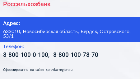 Россельхозбанк по адресу 633010, Новосибирская область, Бердск, Островского, 53/1 в дальнейшем Организация, размещена в следующих категориях: