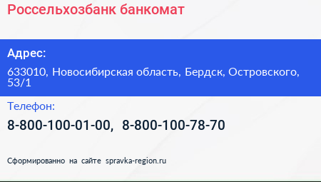 Россельхозбанк, банкомат по адресу 633010, Новосибирская область, Бердск, Островского, 53/1 в дальнейшем Организация, размещена в следующих категориях: