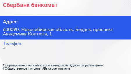СберБанк, банкомат по адресу 630090, Новосибирская область, Бердск, проспект Академика Коптюга, 1 в дальнейшем Организация, размещена в следующих категориях: