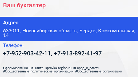 Ваш бухгалтер по адресу 633011, Новосибирская область, Бердск, Комсомольская, 14 в дальнейшем Организация, размещена в следующих категориях: