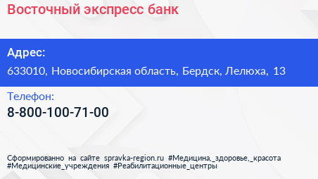 Восточный экспресс банк по адресу 633010, Новосибирская область, Бердск, Лелюха, 13 в дальнейшем Организация, размещена в следующих категориях: