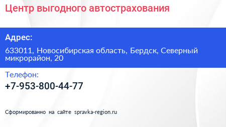Центр выгодного автострахования по адресу 633011, Новосибирская область, Бердск, Северный микрорайон, 20 в дальнейшем Организация, размещена в следующих категориях: