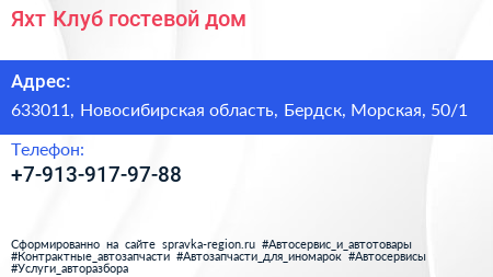 Яхт-Клуб, гостевой дом по адресу 633011, Новосибирская область, Бердск, Морская, 50/1 в дальнейшем Организация, размещена в следующих категориях: