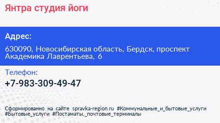 Янтра, студия йоги по адресу 630090, Новосибирская область, Бердск, проспект Академика Лаврентьева, 6 в дальнейшем Организация, размещена в следующих категориях: