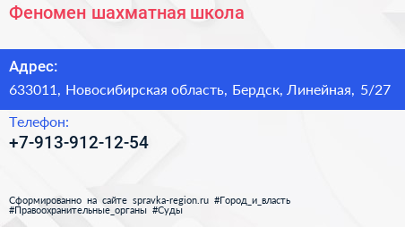 Феномен, шахматная школа по адресу 633011, Новосибирская область, Бердск, Линейная, 5/27 в дальнейшем Организация, размещена в следующих категориях: