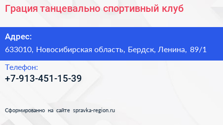 Грация, танцевально-спортивный клуб по адресу 633010, Новосибирская область, Бердск, Ленина, 89/1 в дальнейшем Организация, размещена в следующих категориях: