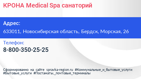 КРОНА Medical & Spa, санаторий по адресу 633011, Новосибирская область, Бердск, Морская, 26 в дальнейшем Организация, размещена в следующих категориях: