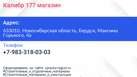 Калибр 177, магазин по адресу 633010, Новосибирская область, Бердск, Максима Горького, 4а в дальнейшем Организация, размещена в следующих категориях:
