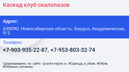 Каскад, клуб скалолазов по адресу 630090, Новосибирская область, Бердск, Академическая, 9/1 в дальнейшем Организация, размещена в следующих категориях: