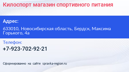Килоспорт, магазин спортивного питания по адресу 633010, Новосибирская область, Бердск, Максима Горького, 4а в дальнейшем Организация, размещена в следующих категориях: