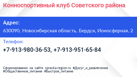 Конноспортивный клуб Советского района по адресу 630090, Новосибирская область, Бердск, Ионосферная, 2 в дальнейшем Организация, размещена в следующих категориях: