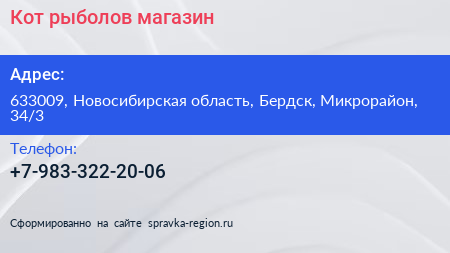 Кот-рыболов, магазин по адресу 633009, Новосибирская область, Бердск, Микрорайон, 34/3 в дальнейшем Организация, размещена в следующих категориях: