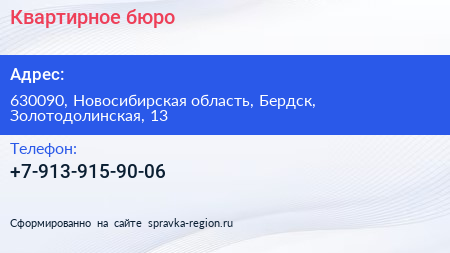 Квартирное бюро по адресу 630090, Новосибирская область, Бердск, Золотодолинская, 13 в дальнейшем Организация, размещена в следующих категориях: