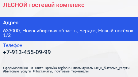 ЛЕСНОЙ, гостевой комплекс по адресу 633000, Новосибирская область, Бердск, Новый посёлок, 1/2 в дальнейшем Организация, размещена в следующих категориях: