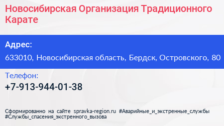 Новосибирская Организация Традиционного Карате по адресу 633010, Новосибирская область, Бердск, Островского, 80 в дальнейшем Организация, размещена в следующих категориях: