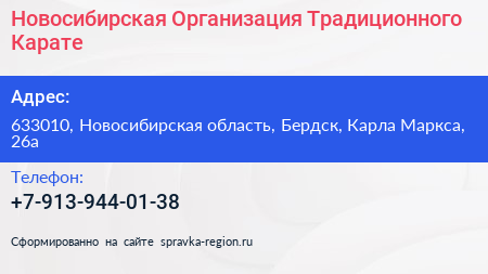 Новосибирская Организация Традиционного Карате по адресу 633010, Новосибирская область, Бердск, Карла Маркса, 26а в дальнейшем Организация, размещена в следующих категориях: