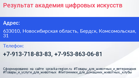 Результат, академия цифровых искусств по адресу 633010, Новосибирская область, Бердск, Комсомольская, 31 в дальнейшем Организация, размещена в следующих категориях: