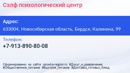 Сэлф, психологический центр по адресу 633004, Новосибирская область, Бердск, Калинина, 99 в дальнейшем Организация, размещена в следующих категориях:
