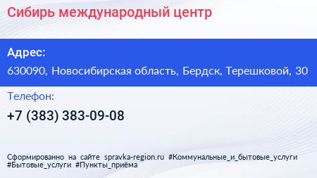 Сибирь, международный центр по адресу 630090, Новосибирская область, Бердск, Терешковой, 30 в дальнейшем Организация, размещена в следующих категориях: