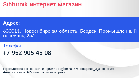 Sibturnik, интернет-магазин по адресу 633011, Новосибирская область, Бердск, Промышленный переулок, 2а/5 в дальнейшем Организация, размещена в следующих категориях: