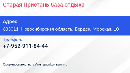 Старая Пристань, база отдыха по адресу 633011, Новосибирская область, Бердск, Морская, 10 в дальнейшем Организация, размещена в следующих категориях: