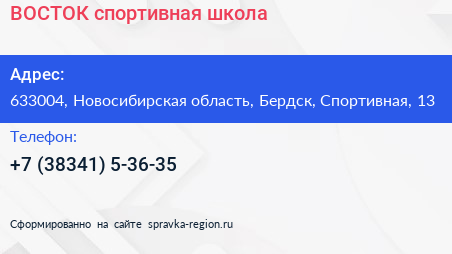 ВОСТОК, спортивная школа по адресу 633004, Новосибирская область, Бердск, Спортивная, 13 в дальнейшем Организация, размещена в следующих категориях: